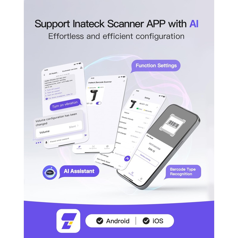 • Inateck SDK and app: The BCST-23 supports the Inateck scanner app for easy configuration including barcode detection, Bluetooth connection and management, battery status display and more. The seamless integration with our SDK into your ERP system enables effective use of the barcode scanner in your ERP system and increases productivity. Supported development languages are Python, Kotlin, Java, C, JavaScript, TypeScript, Objective C, Swift