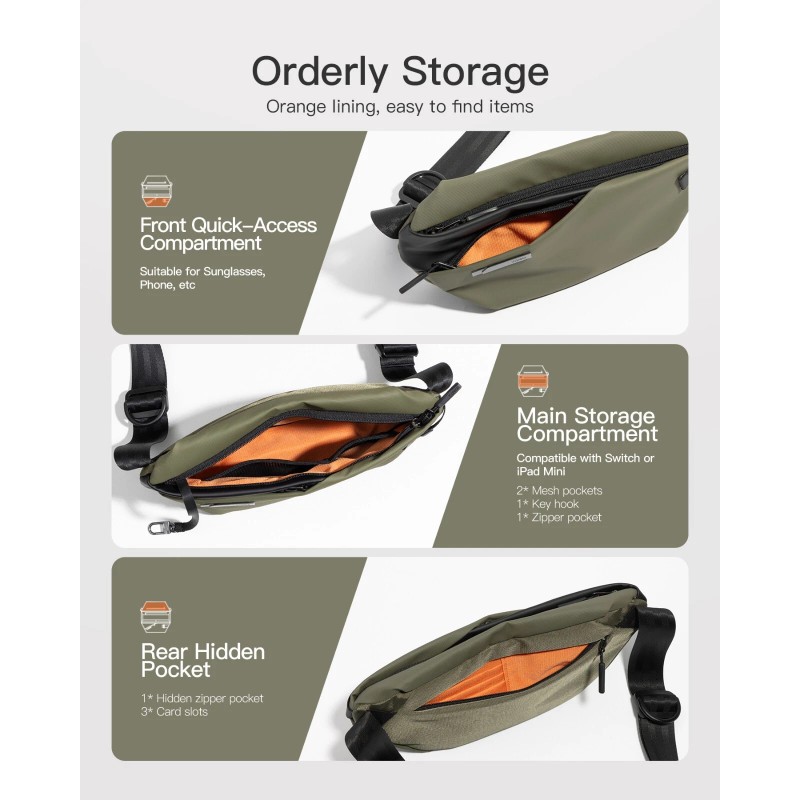 - Orderly Storage: (Size)The exterior dimensions of this sling bag measure 12.6 x 2.8 x 6.7 inches. The main compartment is compatible with Switch, while the front has two mesh pockets for small items. The back of the main compartment includes a zipper pocket for valuables and a metal key hook for quick access to keys. The front compartment can hold a phone or sunglasses. There is also a hidden zippered pocket on the back with three card slots for a passport and credit cards