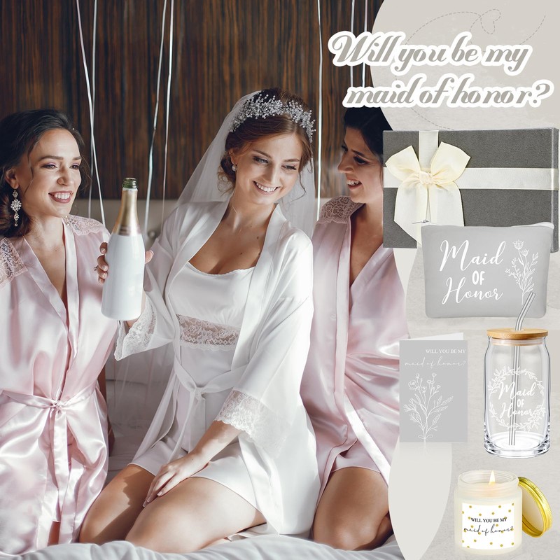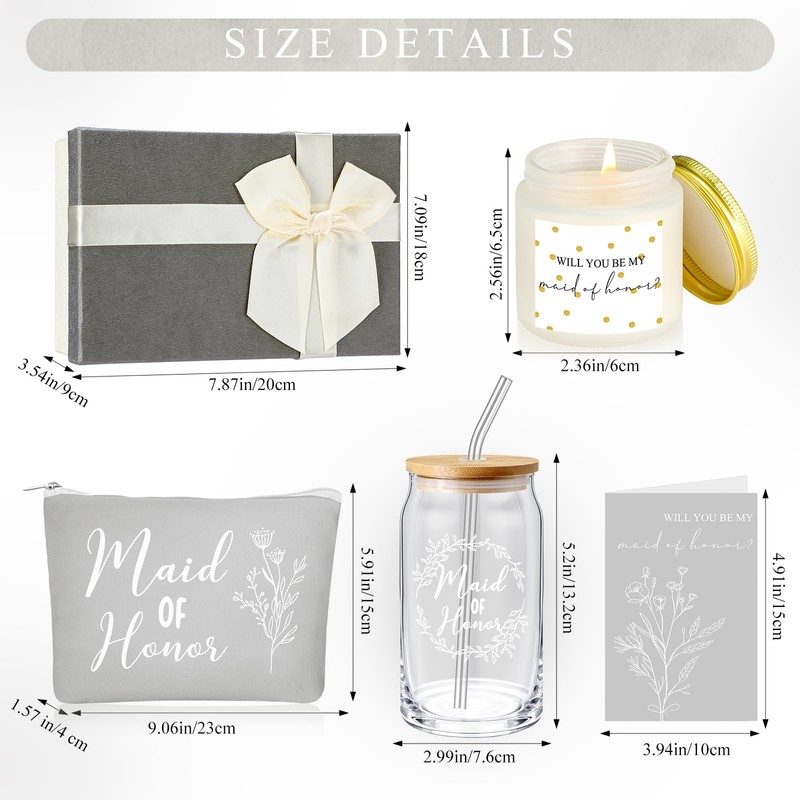 - Package Includes: the maid of honor gifts set includes 1 wedding party cosmetic bag, 1 sage scented candle, 1 glass cup with bamboo lids and glass straw, 1 proposal card and 1 gift box, a complete combination for you to prepare the bridesmaid gifts for wedding day or bridal shower