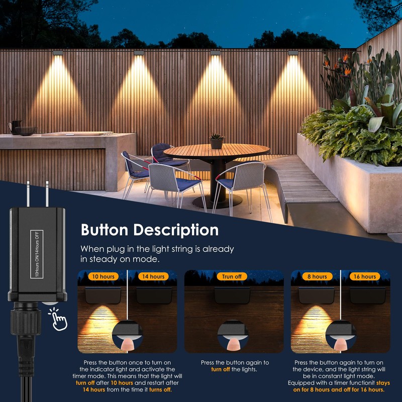 - 【Instructions For Controller】Button description: When plug in the light string is already in steady on mode. ①Press the button once to turn on the indicator light and activate the timer mode. This means that the light will turn off after 10 hours and restart after 14 hours from the time it turns off. ②Press the button again to turn off the lights. ③Press the button again to turn on the device, and the light string will be in constant light mode. Equipped with a timer function, it stays on for 8 hours and off for 16 hours.