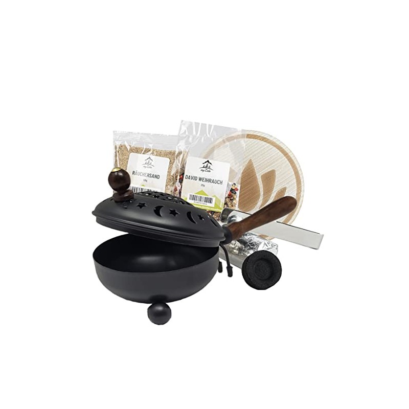 - Box contents: smoking pan, smoking sand, incense, smoking tongs, charcoal, coaster
