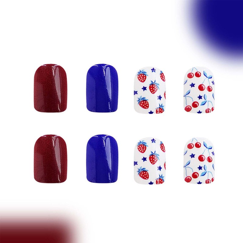 Independence Day Press On Nails 4th Of July Fake Nails Short Square False Nail Star Cherry With Strawberry Design Full Cover Acrylic Glossy Red Glue On Nails Blue Stick On Nails For Women 24pcs