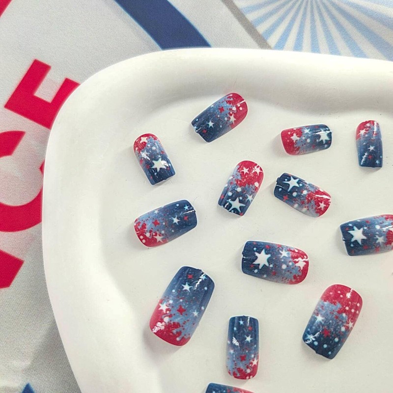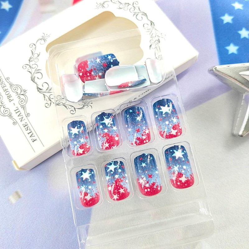 - Package Included: This 4th of July press on nails contains 24 pieces of 12 sizes of Independence Day fake nails, 24 nails stickers,1 nail file, 1pcs alcohol pad, and 3 wooden stick for removing acrylic nails.