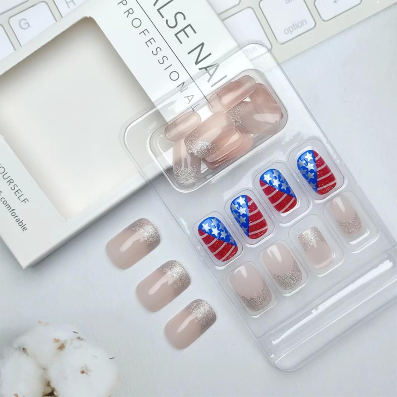 - Package: You'll get 24 pieces 4th of july press on nails,1 mini nail file, 1 small wooden stick, 24 grain jelly glue. You can safely choose a fake nail that fits your finger size and DIY your desired nail shape.
