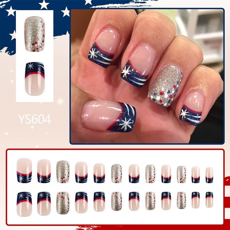 - Independence Day False Nails Design Style : Our fake nails are specially designed for Independence Day. The nails use the classic elements of July 4th Independence Day, blue glitter powder, stars, red white stripes design, to increase patriotic feelings and festive atmospher