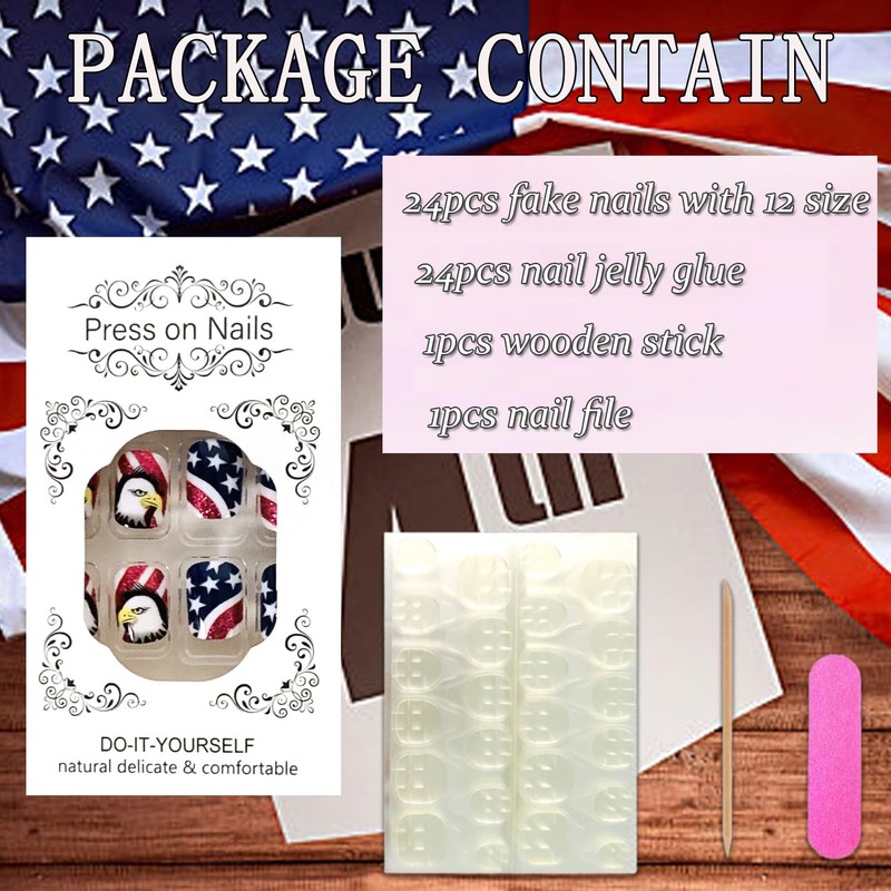 • 【Includes Tool Kit】You'll get 24 Independence Day false nails in 12 sizes. 1 mini nail file, 1 small wooden stick, 1 piece of nail glue sticker. Independence Day glue on nails are perfect for most people's nails.