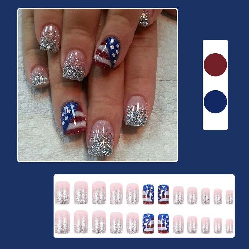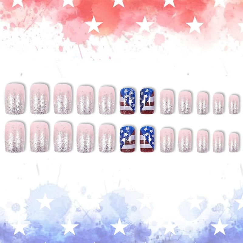 Independence Day Press on Short Square Coffin Nails, July 4th Glossy False Nails with Gradient Glitter Design, Star Stripe Acrylic Nails for Women Holiday Manicure Supplies (24Pcs)