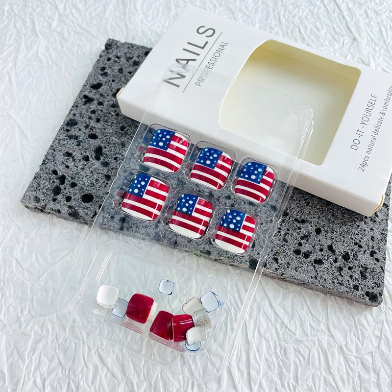 - Package Contents: You will get 24 pieces Independence Day press on toenails, 1 mini nail file, 1 small wooden stick, 24 jelly glue stickers. You can safely choose a fake toenails that fits your toe size and DIY your desired nail shape