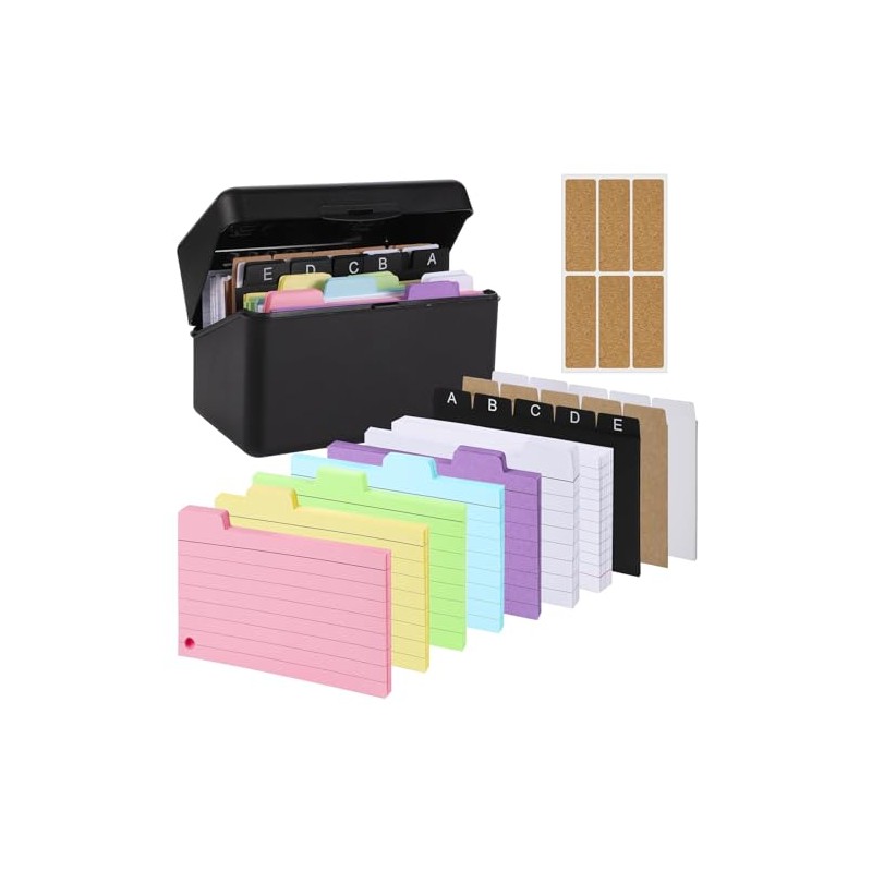- Package includes:This versatile index card set includes everything you need to stay organized, with a 3-inch black card box, 180 colorful tabbed index cards in 6 vibrant colors, and 50 red and blue-lined index cards (110gsm). It also comes with 5 A-E black dividers, 5 white dividers, 5 kraft dividers, 6 wooden stickers for easy labeling, and 6 metal binder rings (40mm outer diameter). With this complete set, you can neatly store and categorize all your important information in one place.