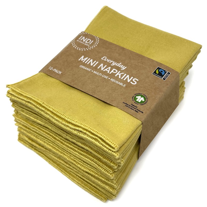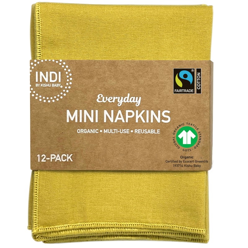 Indi by Kishu Baby - GOTS Certified 100% Organic Cotton Washable Mini Cloth Napkin Sets - Set of 12 Fairtrade Soft Muslin Napkins for All Occasions (Mustard)