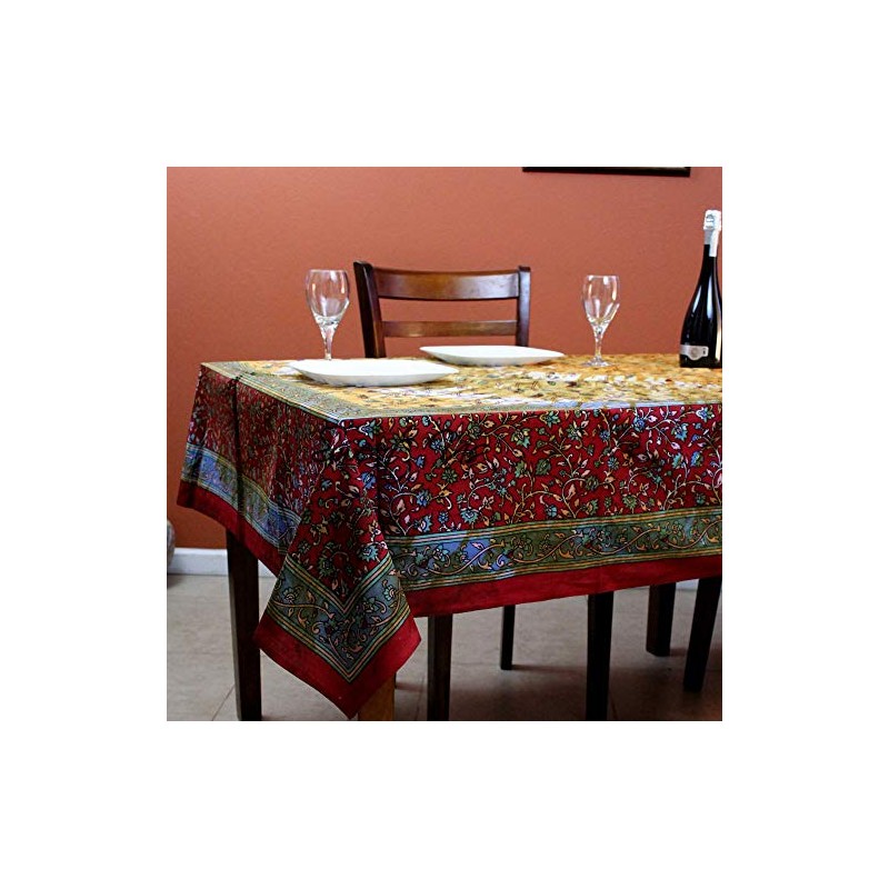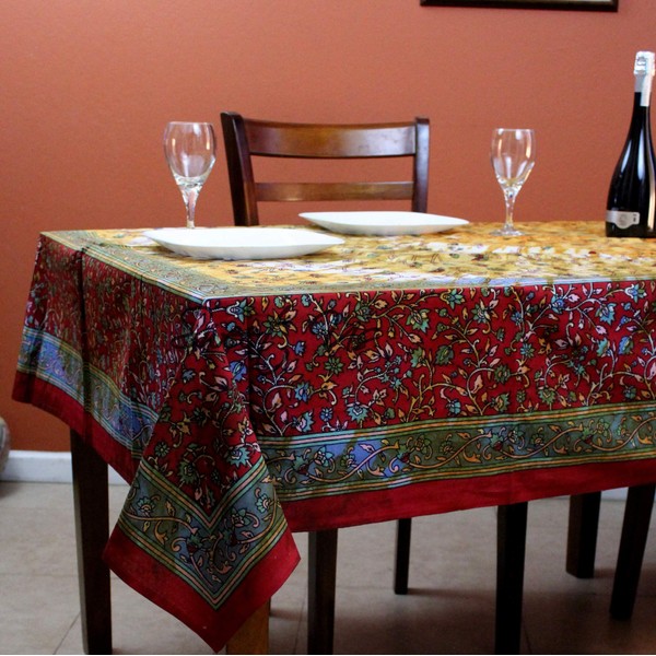 India Arts Cotton Floral Tie Dye Tablecloth Rectangle Red Tan Kitchen Dining Linen