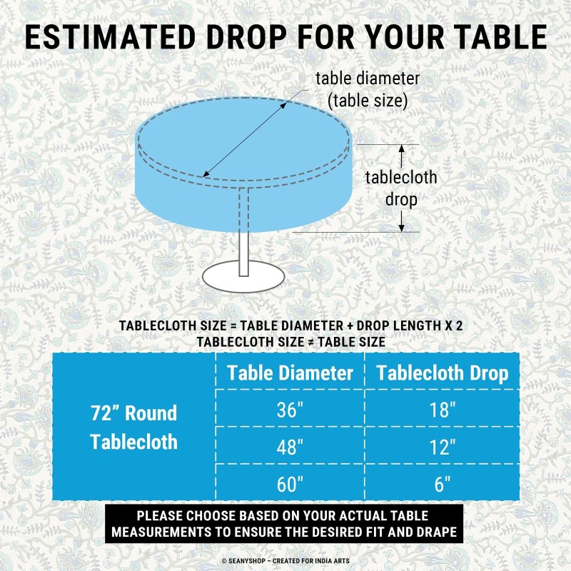 Easy to Maintain: This 72 inch round tablecloth can be machine washed separately in cold water on a gentle cycle and tumble dry low. It fits round tables measuring 36 to 60 inches in diameter. Refer to our size guide for an estimated drape. Please choose based on your actual table measurements to ensure the desired fit and drape