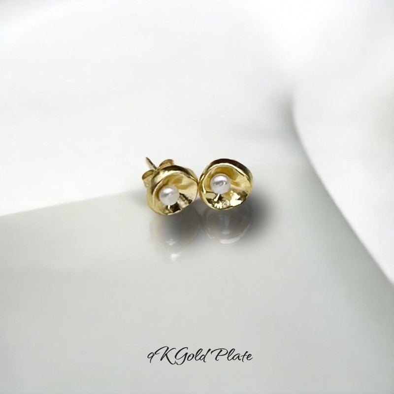 - DESIGN: Elegant 9K gold-plated stud earrings featuring a delicate pearl centrepiece in a contemporary concave setting