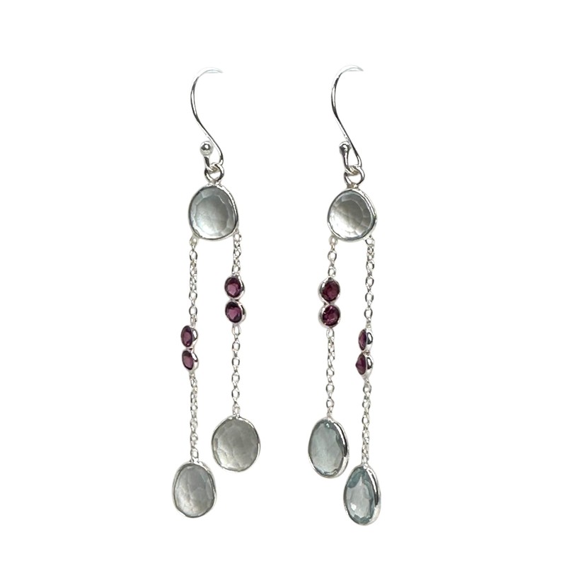 India with Love Sterling Silver Drop Earrings, Blue Topaz and Ruby Gemstones, Double Chain Design