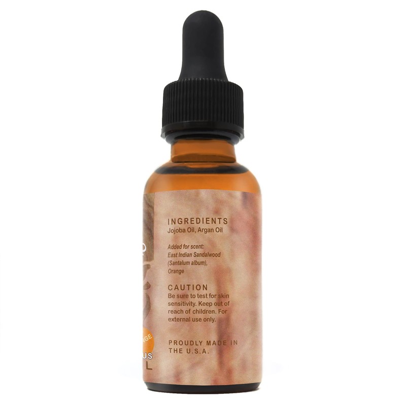 - All-natural beard oil blend of Golden Jojoba and Moroccan Argan oils, a generous amount of Indian Sandalwood plus Orange essential oil