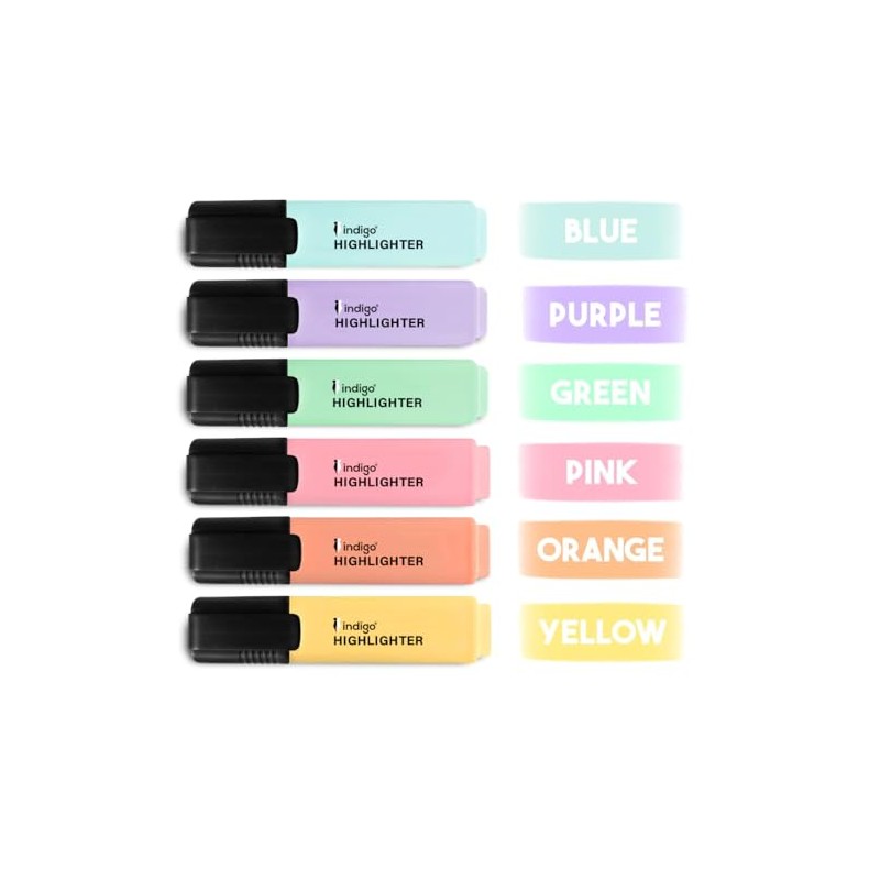 indigo® Chisel Tipped Pastel Highlighter | 6 Assorted Pastel Colours Highlighters