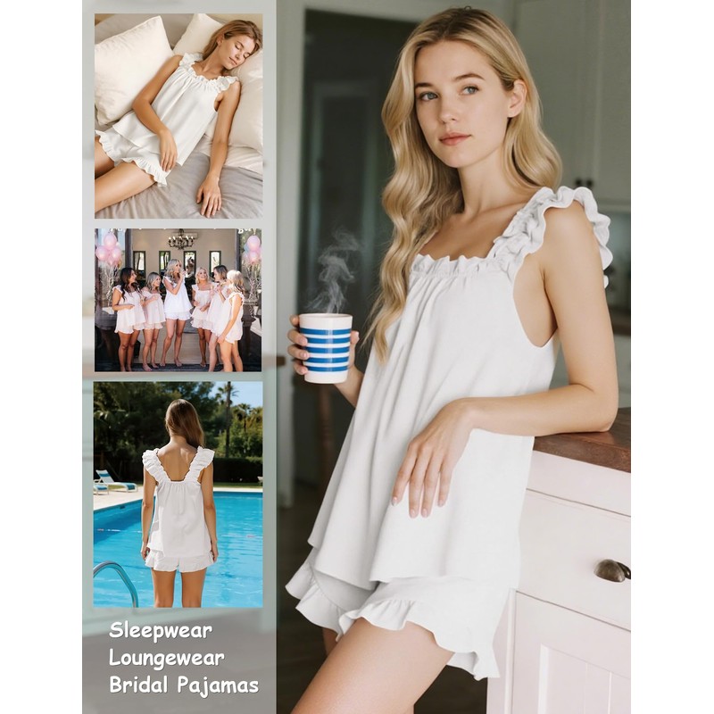 Indoner Womens Pajama Sets Ruffle Tank Top and Shorts Sleepwear 2 Piece Pjs Set Soft Sleeveless Summer Loungewear Sleepwear Nightwear White