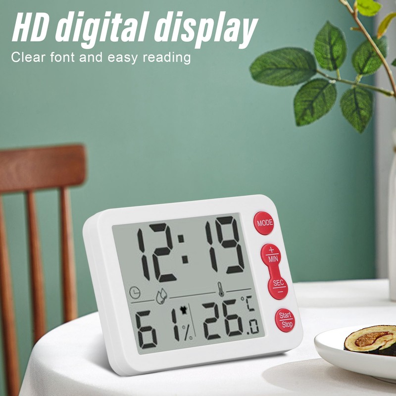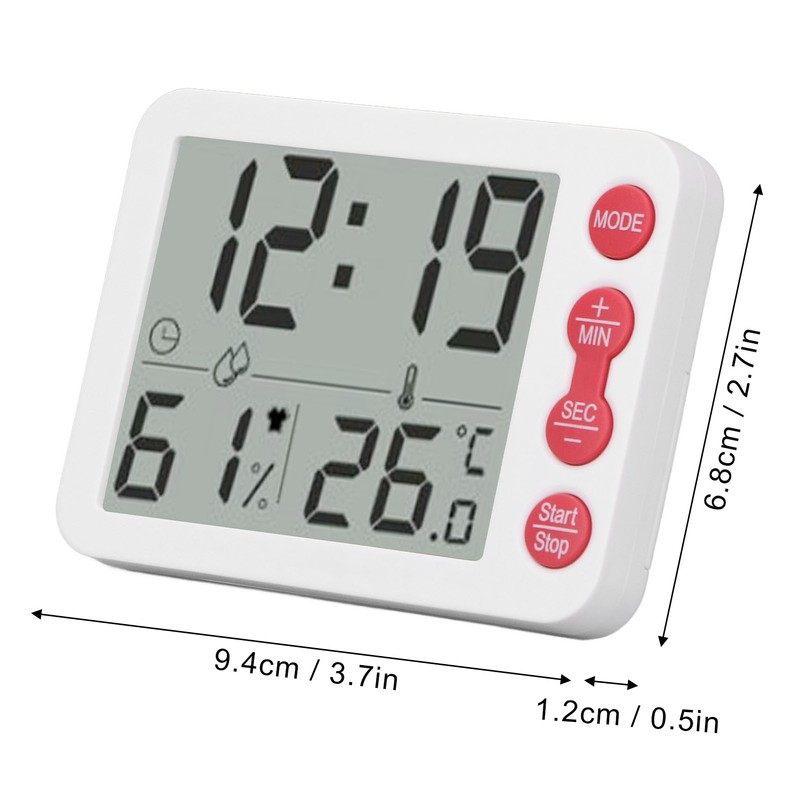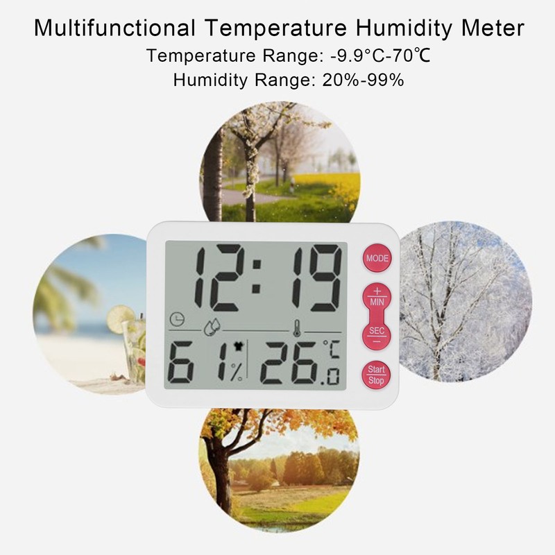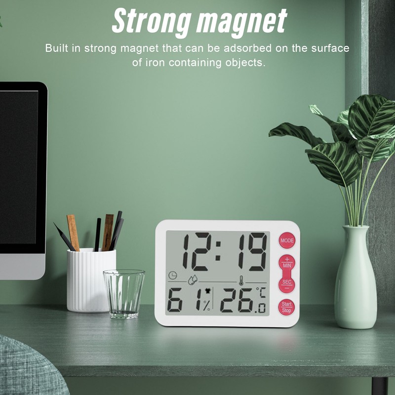 1、Multi Function: Digital hygrometer thermometer can not only measure indoor temperature and humidity, but also be used as a desktop alarm clock. It can set time and alarm clock, with 12 and 24 hour switching. 2、Accurate Measurement: With convection hole on the back, this multifunctional can measure the temperature and humidity accurately. Sensitive sensing to ensure high accuracy. 3、Large Digital Display: The humidity meter features a large high definition digital display which can clearly displays the humidity temperature datas, and it is very easy to read. 4、Powerful Magnet: Built in powerful magnet, so this multi function digital thermometer hygrometer can be adsorbed on any objects surfaces containing iron. 5、Applicable Scenes: This digital thermometer is very suitable for aquariums, schools, greenhouses, garages, warehouses, baby rooms, laboratories and gardens.