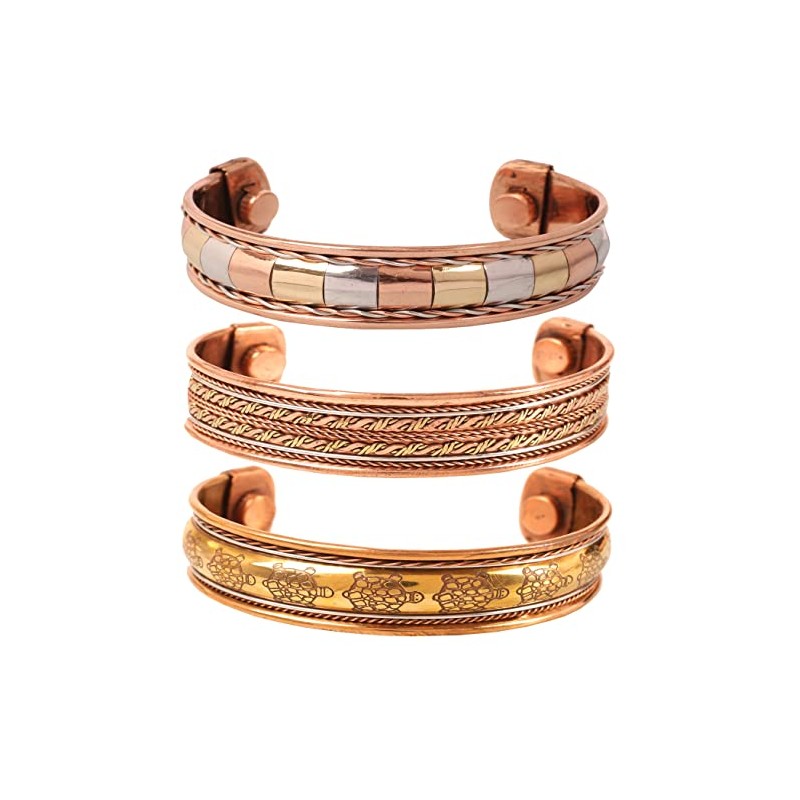 INDTRESOR Copper Magnetic Bracelet Tibetan Style. Hand Forged with Solid and high Gauge Celtic Tortoise Pure Copper. Set of 3 Different Designs in 3 Metals.