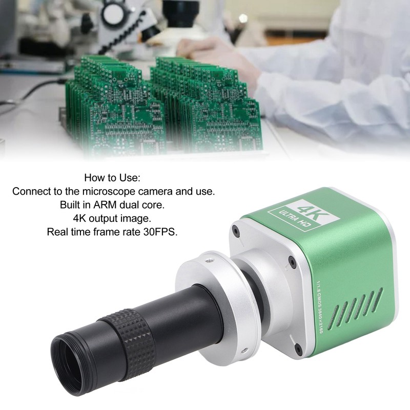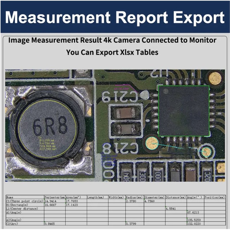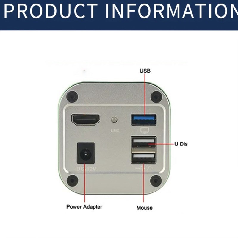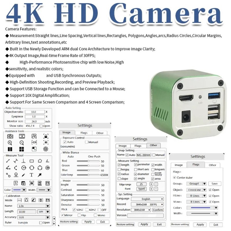 1、Easier Measurement: The grid line function supports straight lines, line spacing, vertical lines, rectangles, polygons, angles, arcs, radius circles, circular margins, arbitrary lines, text annotations, etc. 2、High Definition: Built in ARM dual core architecture, improving image clarity. 4K output image, real time frame rate of 30FPS. 3、Clear Imaging: High performance photosensitive chip with low noise, high sensitivity, and realistic colors. Also supports high definition photo shooting, recording, and playback. 4、Universal Interfaces: Equipped with High Definition Multimedia Interface and USB interface for output. Support USB storage function, can be connected to a mouse. 5、Microscope Camera: Support 10X digital amplification. Supports 2 screen comparison as well as 4 screen comparison, very convenient to operate.