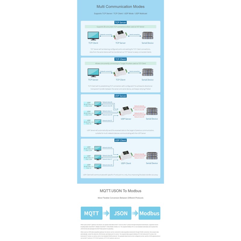 • Multiple Communication Modes - Supports TCP Server, TCP Client, UDP mode, and UDP multicast, ensuring reliable and efficient data exchange across various industrial network environments.