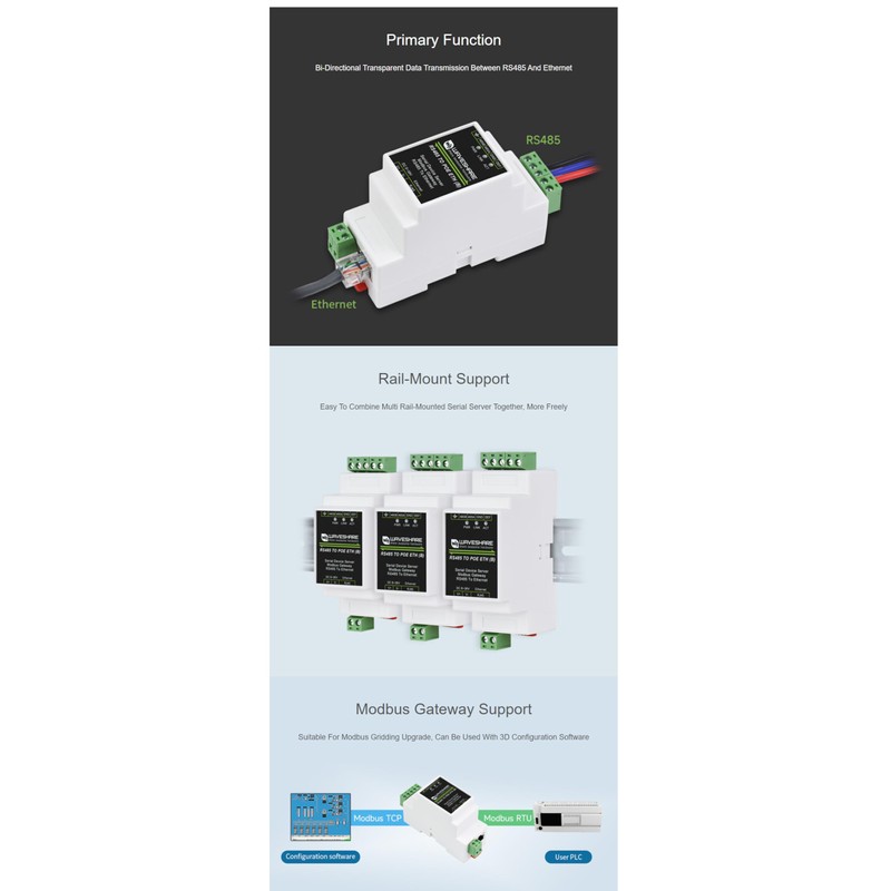 • RS485 to Ethernet Conversion - This RS485 serial server enables seamless bi-directional data transmission between RS485 and Ethernet, supporting TCP/IP protocol for industrial IoT applications.