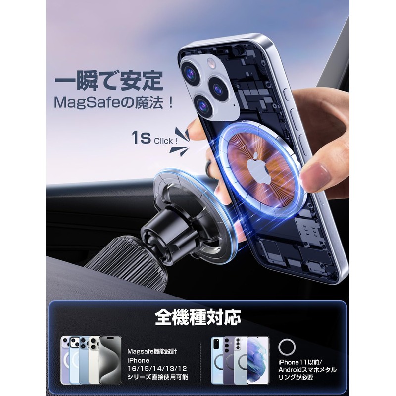 - (Compatible with All Models, Metal Ring Included, No Wireless Charging Affection) iPhone 16/15/14/13/12 series with magsafe functions: iPhone 16/16Plus/16pro/16pro max/iPhone 15/15 Plus/15 Pro/15 Pro Max/14/14 Plus/14 Pro/14 Pro Max/13/14 3 mini/1 Can be directly attached to the 3 Pro/13 Pro Max/12/12mini/12Pro/12 Pro Max body or MagSafe case This item comes with a strong adhesive metal ring. Using the included metal ring, the magnetic force will be stronger. If you attach the metal ring to your Android smartphone or MagSafe case, you can use the smartphone holder. Furthermore, the unique metal ring does not interfere with the wireless charging function of your smartphone, and it is convenient to charge wirelessly even if you attach it to your smartphone