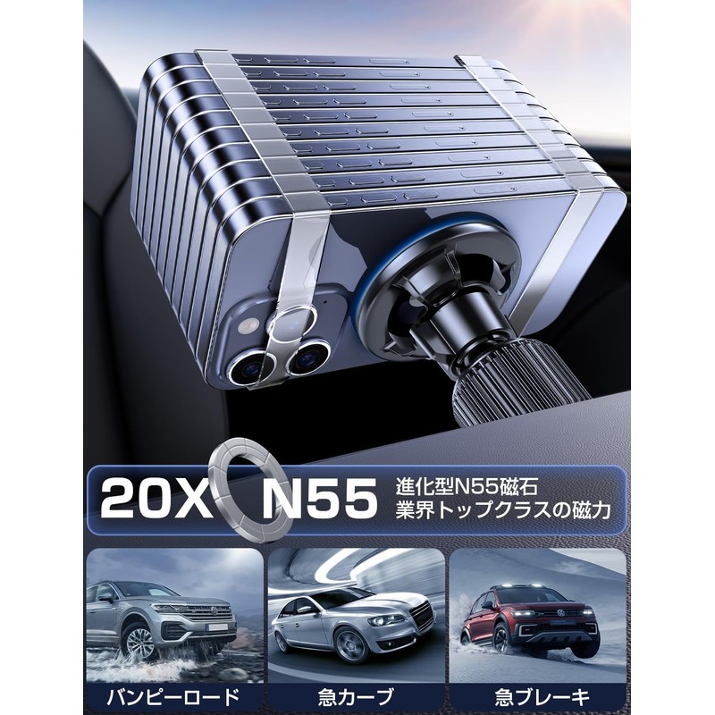 - Instantaneously detached in 1 second, easy to install with one hand, 2 x 360° rotatable: Unlike the car stand with a variety of installation procedures required during conventional use, simply place your smartphone on our latest Magsafe car holder and put it on and off in just 1 second. Since it is magnetic, it has instant suction properties, and it will be set and fixed by simply moving it close. Easy and quick installation and removal reduces stress when driving and provides safety In addition, the pedestal can be rotated 360 degrees, and the instant suction magnet holder for 1 second has no angle restrictions, so it can meet your needs of 360 degrees rotation in landscape and portrait mode. It has a wide range of motion and can be adjusted to the angle of the head and down, so you can adjust the angle that is easy to see for yourself
