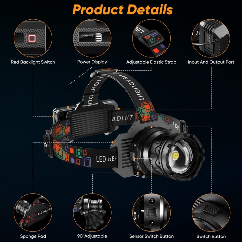 - Zoomable and 90° Adjustable: The flexible high lumen headlamp head features a zoom function that allows you to switch between spotlight and floodlight, 90° adjustable lamp head provides more angles of light sources to meet your daily needs, such as repairing, walking, camping