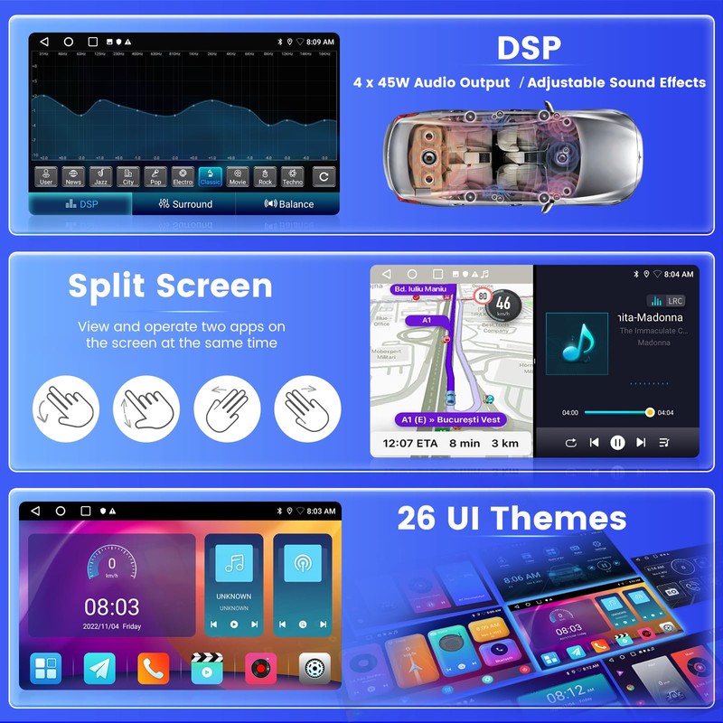 - 2+64G Android with DSP: The latest Android system comes with 2GB RAM and 64GB ROM for more apps installed. 2.5D 1024 x 600 screen supports split screen and video output. Switch between 26 different desktop themes. Digital Signal Processing(DSP) supports 32-band EQ options