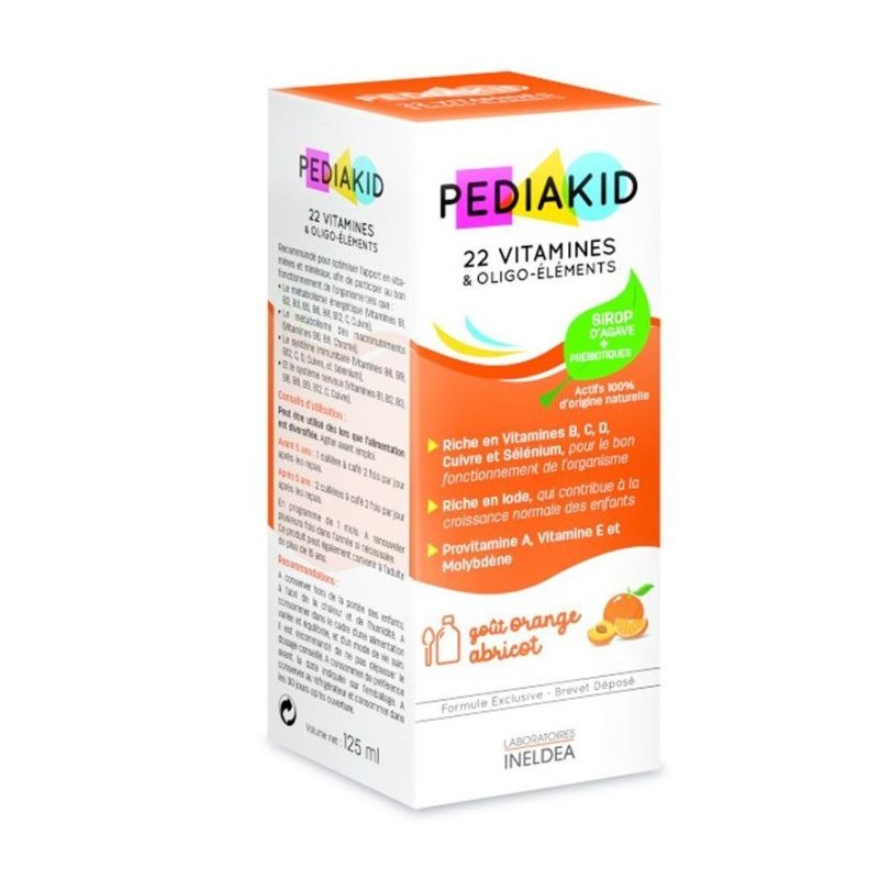 Recommended for young children to pre-adolescents, Pediakid 22 vitamins and trace elements syrup 125ml combines the most effective natural active ingredients to promote balanced growth and harmonious development. Its gentle and energizing formula is ideal for optimizing the intake of vitamins and minerals, on a daily basis, in order to effectively stimulate fitness and general balance. Syrup based on Carrot, Watercress, Spinach, Beetroot, Parsley extract, Vitamins, Iron, Manganese, Magnesium, Copper, Zinc, Fluorine, Iodine, Molybdenum, Selenium and Chromium.
