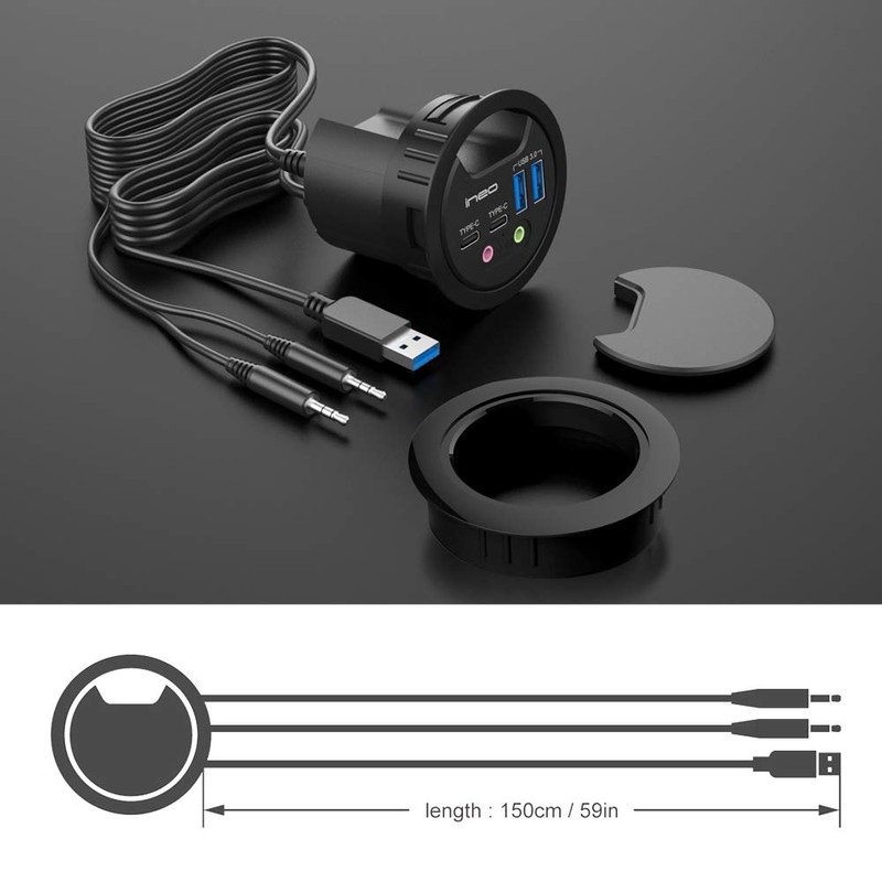 ineo Grommet Desk-Fit (Diameter 2.3" to 2.4") 2Type A + 2Type C with 3.5mm Audio Mic Jack + 3.2" Expandable case (Power is not Included)[THC06 - VI Plus]