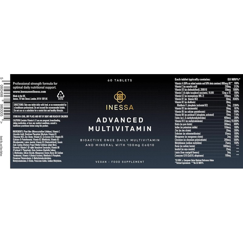 Inessa Multivitamin with CoQ10 100mg, Vitamin D3 2000 IU, K2 100mcg, B Complex, Vitamins A 800mcg, Folic Acid as 5-MTHF 400mcg, Zinc 20mg and Lutein