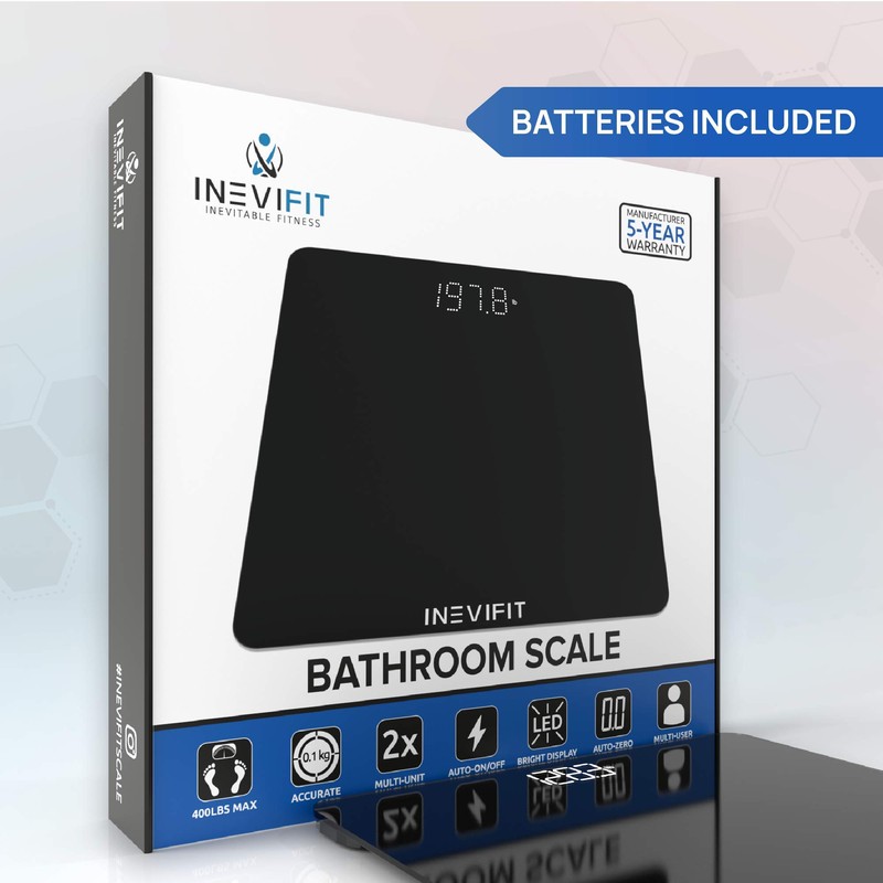 - SIMPLE & CONVENIENT: The INEVIFIT Bathroom Scale is equipped with Auto-Calibrating sensors which provide you with precise measurements for you and an unlimited number of family members every time.