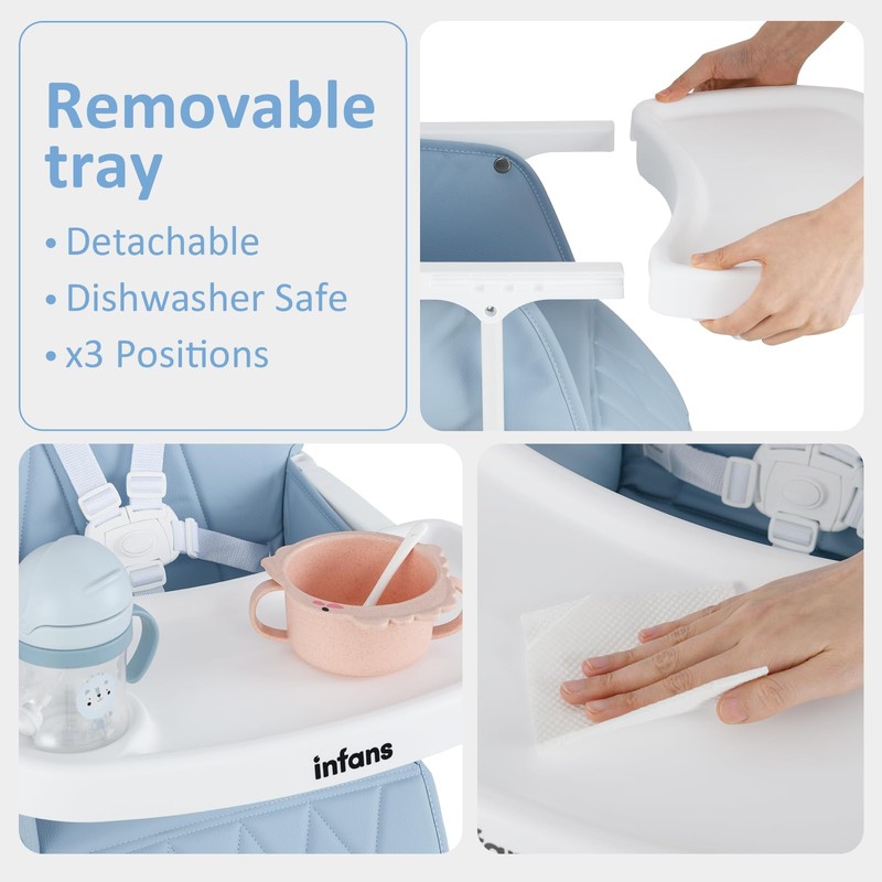 - Easy to Clean: Our baby travel high chair come with removable trays and cushions for easy cleaning and maintenance after daily use. The removable PP tray is dishwasher safe. The PU leather cushion is waterproof and all you need to do is wipe the stain with a clean cloth.