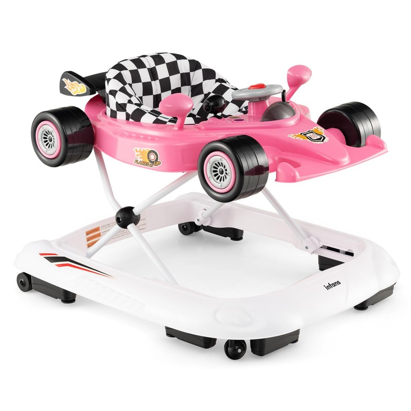 INFANS Foldable Baby Walker, 3 in 1 Toddler Activity Center Leaning-Seated Walk-Behind with Steering Wheel, Adjustable Height, Lights, Music, Washable Seat Cushion (Pink)