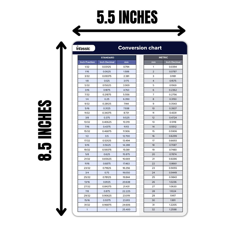 • ➜ NUMBER RANGE - The Infassic magnet shows conversions from 1/32 (0.03125) inches to 1 inch or 0.794 mm to 25.4 mm. It also goes from 1 mm to 32 mm or 0.0394 inches to 1.2598 inches.
