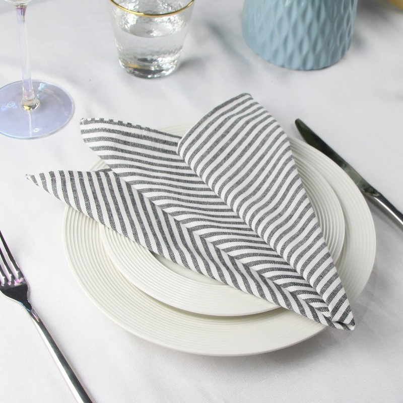 INFEI Plain Striped Cotton Linen Blended Dinner Cloth Napkins - Set of 12 (17 x 17 inches) - for Events & Home Use (Black)