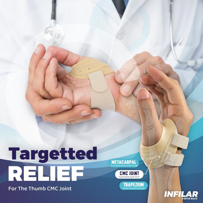 - 👍 Say goodbye to joint discomfort with our INFILAR thumb brace — This CMC thumb brace provides immediate and lasting relief from thumb discomfort, ligament instability, tendonitis, and sprains. It gives you the support and stability you need to prevent and treat discomfort or injury.
