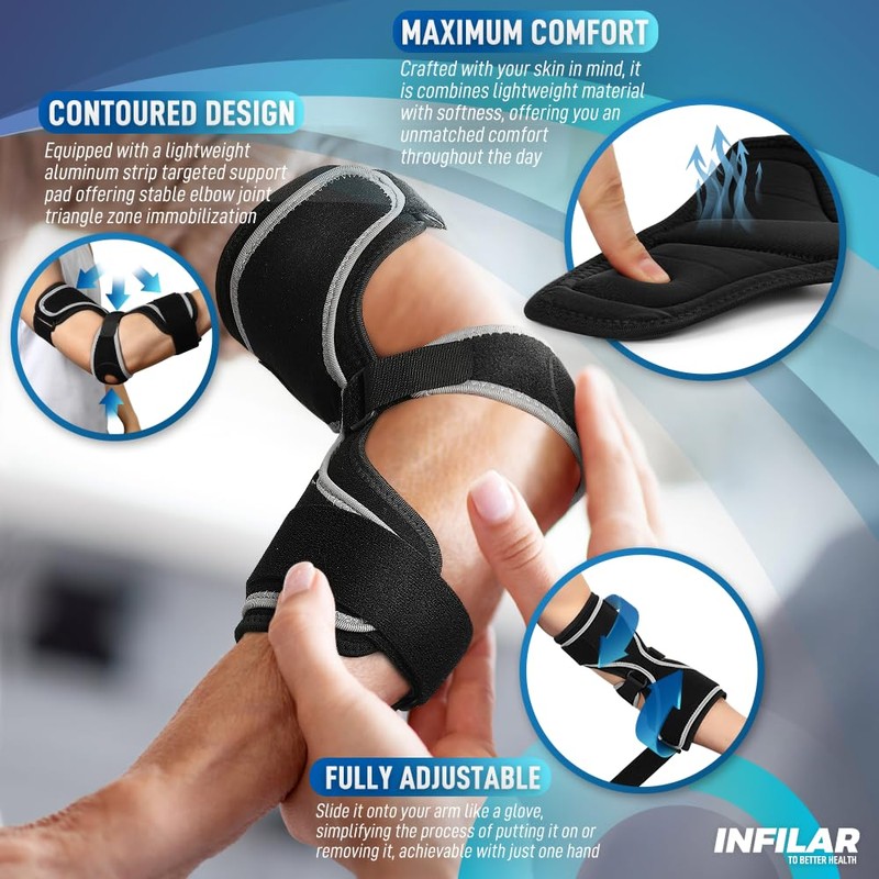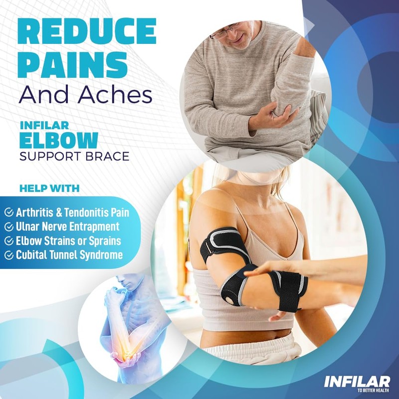 - Say Goodbye to Elbow Pain Today! - The INFILAR elbow brace is your go-to for managing discomfort during sleep and day-to-day actions that involve repeated elbow use. It efficiently speeds up recovery for various elbow issues, including , cubital tunnel syndrome, sprains, and ulnar nerve pressure, by offering robust support and diminishing stress.