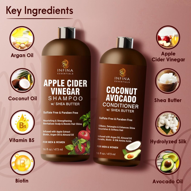 - Deeply Nourishing Formula: The moisturizing blend of coconut conditioner and Shea Butter in our apple cider vinegar shampoo and conditioner helps combat dryness and frizz, leaving your locks soft and manageable
