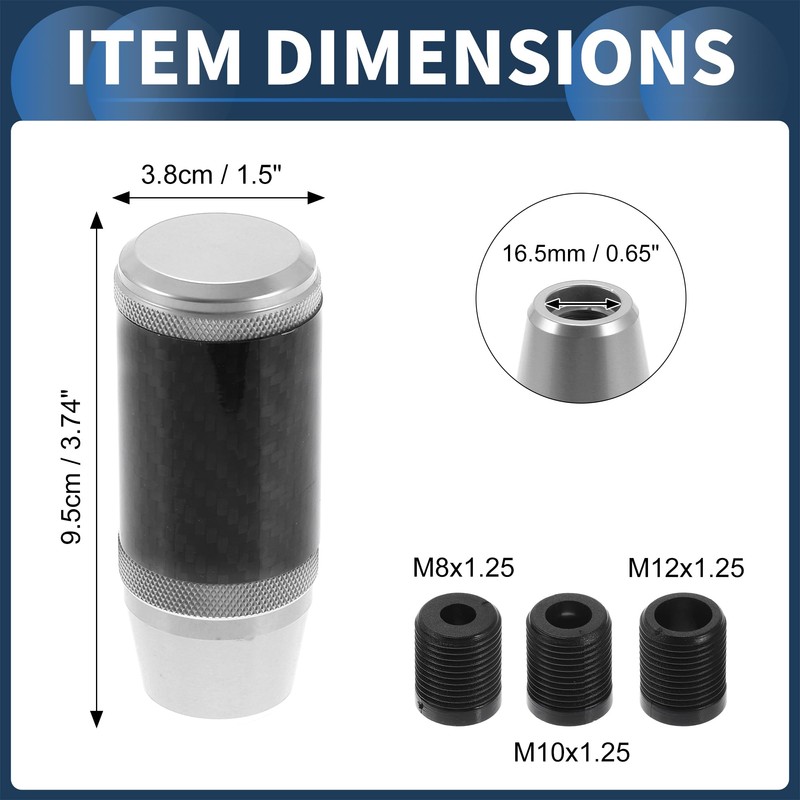 - Installation Steps: 1. Remove the existing gear shift head; 2. Select and install the correct adapter (M8x1.25/M10x1.25/M12x1.25); 3. Install the new gear knob on the adapter; 4. Insert the shift knob rod directly and tighten it to complete the installation.