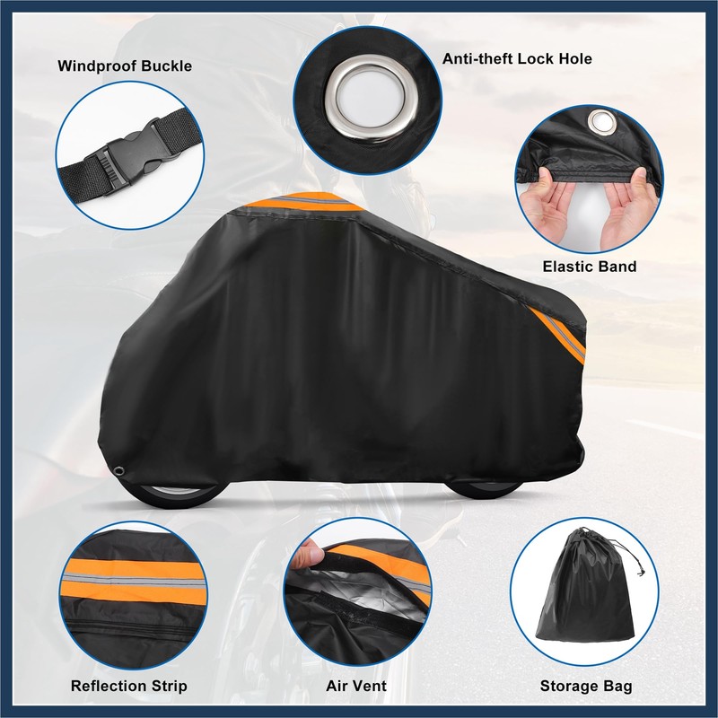 - Comfortable: Details Improvement: ①The surrounding night reflective strips protect your Motorcycle at night for security and easily find your motorbike. ②great breathable performance thanks to ventilation openings on the side. ③Lock Hole can be firmly fixed on the motorcycle. ④Complimentary storage bag.