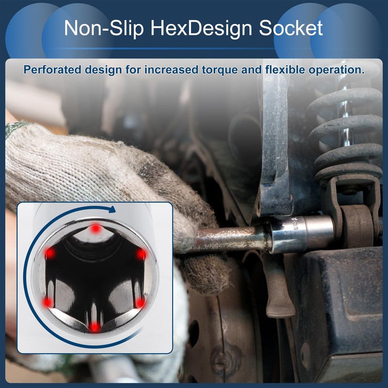 - Material:Anti-Slip Socket adopting CR-V material, reinforced it's strength and durability for multiple use to withstand torque. Portable to easy carry, powerful solution to your problem.