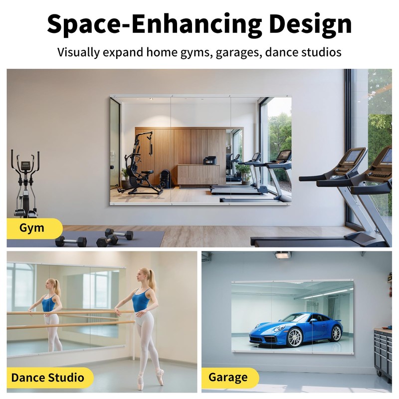 - Versatile Multi-Space Design:InfiniGlass mirrors seamlessly adapt to any space from home gyms to dance studios, bedrooms to garages. The frameless modern look enhances decor while providing perfect reflections for fitness, yoga or daily routines, with flexible arrangement options for full-wall coverage or standalone use.