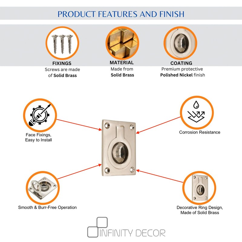 Finish: This flush ring pull has an attractive polished nickel finish which provides a modern look to your home furniture’s. It has a substantial premium feel and polished surface. This finish has corrosion resistance property which helps to prevent rust. It will make maintenance a breeze, as it resists tarnishing and is easy to clean.