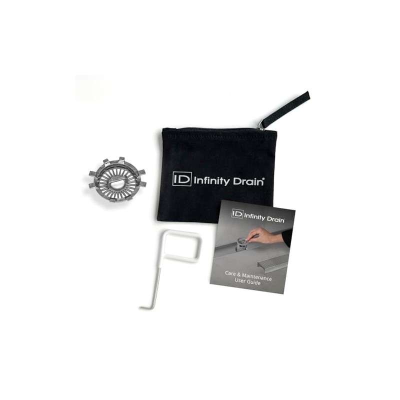 Infinity Drain HMK-U Hair Maintenance Kit. Includes maintenance guide, DKEY Lift-out key, and HS 2 Hair Strainer.