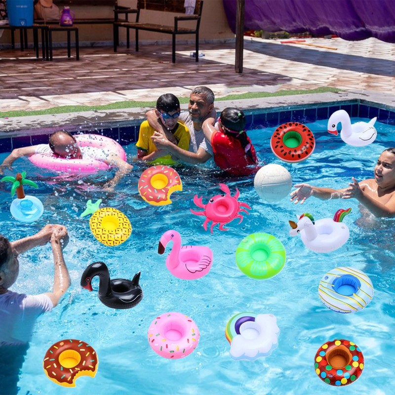 - ENJOY THE SUMMER FUN This 15 pack drink holder pool includes coconut tree, purple doughnut, watermelon, unicorn with ears, white swan, pineapple, crab, green lemon, small flamingo, black swan, pink cake, brown dotted cake, blue striped cake, cloud, brown donut designs, which will add a lot of fun and color to your pool and any summer party. Perfect decoration for the summer that will spice up your party atmosphere!