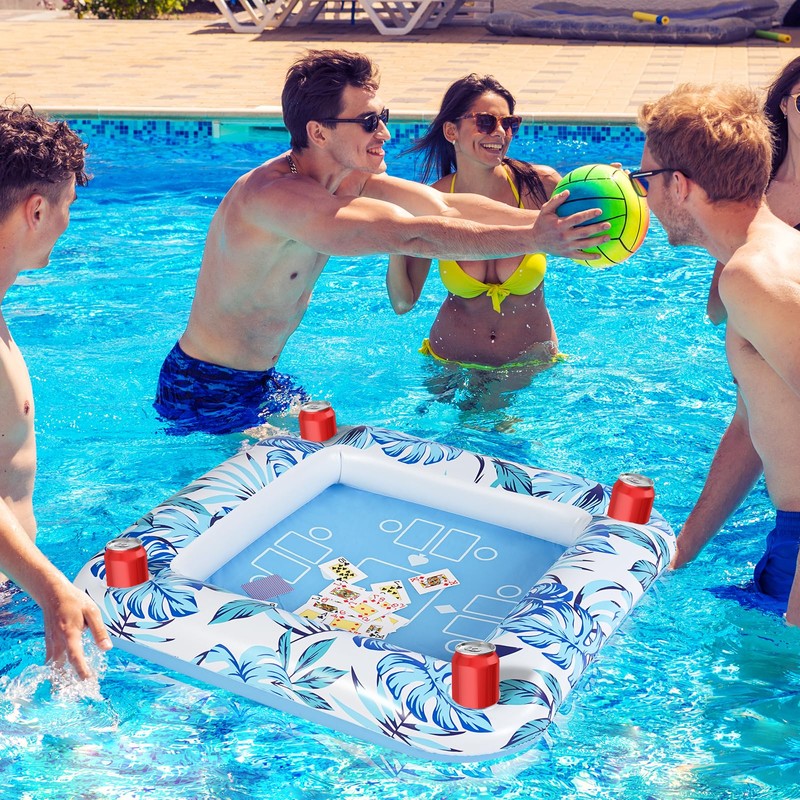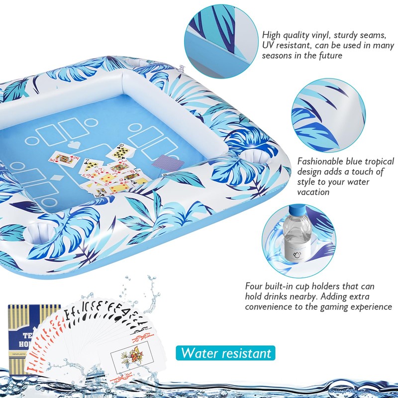 - You can get 1 table and 2 pairs of waterproof playing cards to play and relax with friends. Size: large table -37.4x37.4 inches, perfect for adults and perfect for use at pool parties or other water activities.