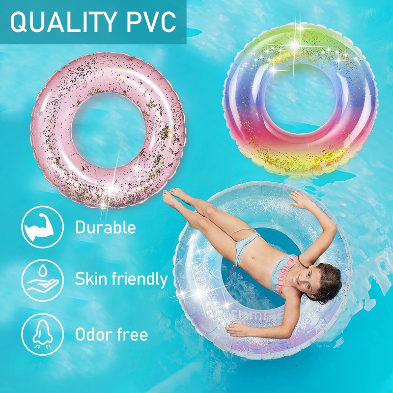 - 【Unique Glitter Design】Swim Rings floats are designed with popular transparent Glitter sequins, with brilliant colors. Pool floats party supplies, best birthday gifts, summer pool Toys gifts for kids. Also, each can be swim tubes for the beach or lake. Add more fun to your summer.